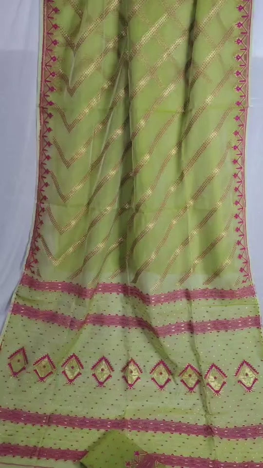 Experience the timeless elegance of the Cotton Dhakai Jamdani Saree, renowned for its intricate handwoven patterns and breathable cotton fabric. This saree combines traditional craftsmanship with everyday comfort, making it ideal for both formal occasions and casual wear. Its lightweight texture ensures ease of draping, while the detailed Jamdani motifs showcase exquisite artistry that reflects rich cultural heritage. Perfect for those who appreciate authentic handloom textiles with lasting quality.