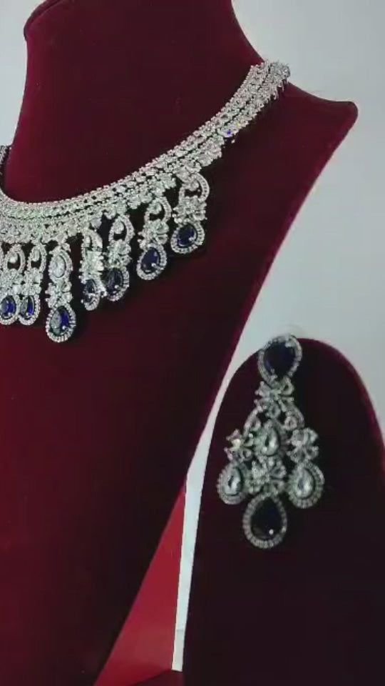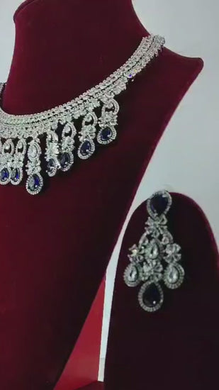 Dazzling Ad Stone Fitted Blue Colour Necklace Set With Maang Tikka