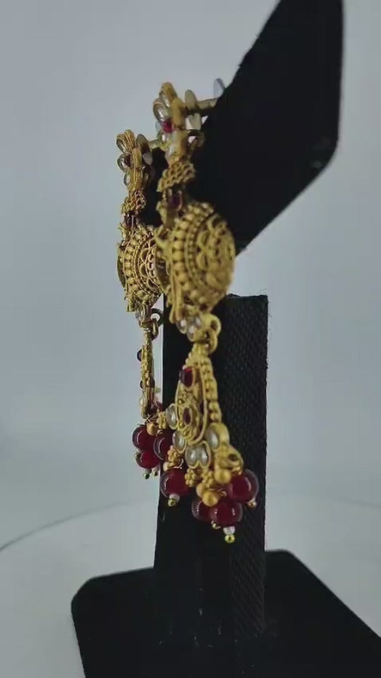 Traditional krishna kundan temple jhumki style golden earring with red drops