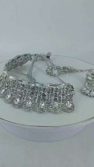 Alloy Artificial Rhodium Stone Necklace Set With Mang Tikka